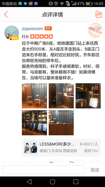 位于中糧廣場B座,地鐵建國門站上來往西走大約500米,從A座左手走到頭,B座正門進來右手即是,相對還比較好找。開車前往也有較充裕的停車位。服務熱情周到,料子手感很柔軟。襯衫、領帶、馬夾都有,整體西服定制店都很不錯!如果師傅在,當場可以量體準備樣衣。