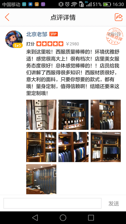 來到這里啦!西服質(zhì)量棒棒的!環(huán)境優(yōu)雅舒適!感覺很高大上!很有檔次!店里的美女服裝顧問服務(wù)態(tài)度很好!總體感覺棒棒的。〉陠T給我們講解了西服定制得很多知識(shí)!西服材質(zhì)很好,意大利的面料,只要你想要的款式,都有哦!量身定制,值得信賴。〗Y(jié)婚還要來這里定制哦!